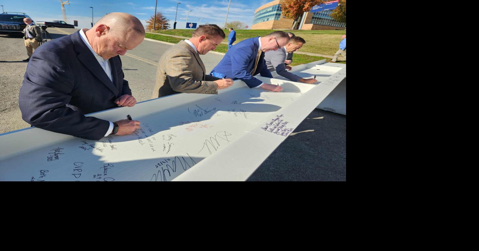 Pejabat Kedokteran WVU berkumpul di Morgantown untuk menandatangani balok baja terakhir untuk WVU Eye Institute.